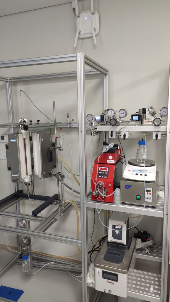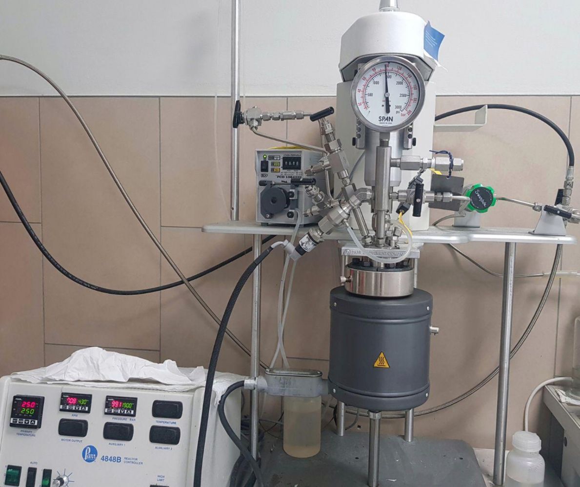 Flow reactor: The testing unit could be used for 0.1-10 g of catalysts. Two types of reactor could be used – a stainless-steel high-pressure reactor (pressure up to 5.0 MPa) and a glass reactor for testes at ambient pressure. Operating up to 800 °C depending on the temperature. Electronic mass flow controllers are used (0-500 ml/min) with a maximum pressure of 10 MPa. The HPLC pump (0.6-600 ml/h) is used to inject liquids into a pressurized reactor operating in continuous flow mode, while the syringe pump (0.73 µL/h to 2100 mL/h) is used for the glass reactor.